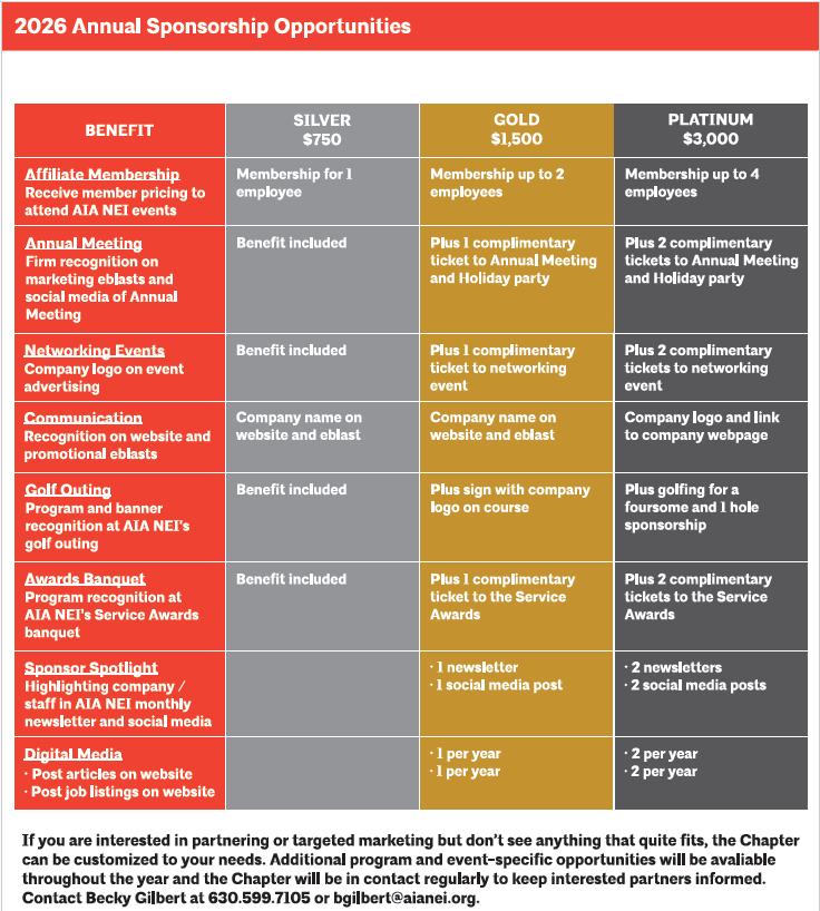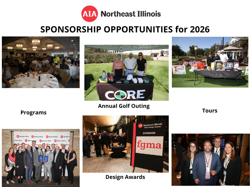 AIA NEI 2026 Annual Sponsorship Opportunities Build Connections. Build Visibility. Build the Future. For more than 150 years, members of the American Institute of Architects have partnered with leaders in the construction industry to create valuable, healthy, secure and sustainable environments. AIA Northeast Illinois invites your organization to partner with our chapter in 2026 and connect you with over 575 members in the northeast Greater Chicago area. Your one-time commitment comes unlocks a year-round promotional package—delivering maximum visibility for your brand, products, and services through our website, social media, newsletters, and in-person programs. This year, we're excited to offer three levels of annual partnerships tailored to fit your individual budget and marketing goals. Join us and make 2026 a year of growth, collaboration, and impact! Click here to download sponsorship options |